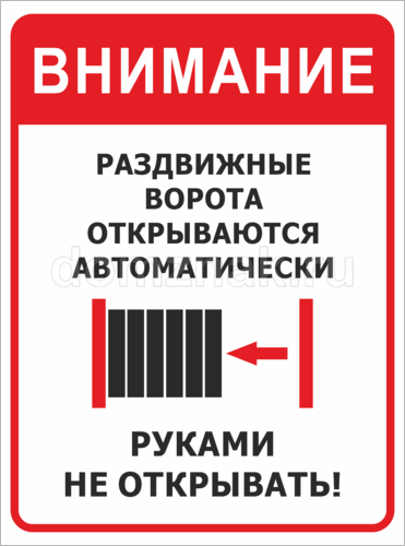 Табличка «Раздвижные ворота открываются автоматически. Руками не открывать!» не только информирует об особенностях конструкции, но сообщает о правилах эксплуатации. Закажите табличку, чтобы точно донести желаемую информацию до адресата.
