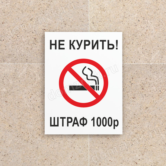 Табличка «Не курить, штраф» – убедительный текст поддерживается лаконичным дизайном и озвученной конкретной цифрой штрафа. Красно-черная цветовая гамма и белый фон привлекают внимание – Ваше требование не останется незамеченным.