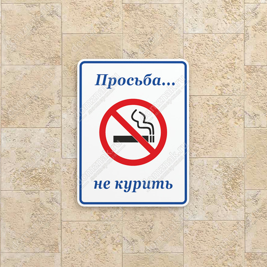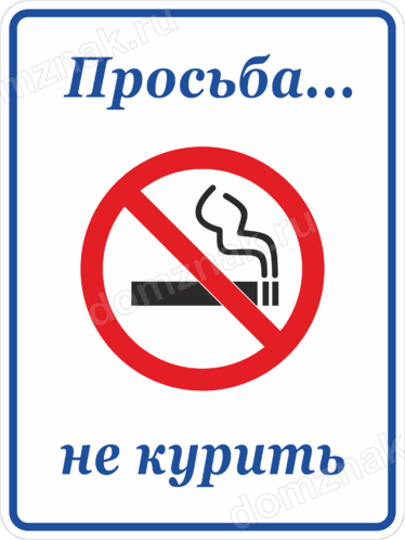 Табличка с просьбой не курить – корректность и грамотное цветовое сочетание спокойного синего и предупреждающего красного позволяет изложить настойчивую просьбу в мягкой форме. Заказать табличку в мастерской «Домзнак» Вы можете в любом цветовом сочетании, в том числе в фирменном стиле Вашей компании.