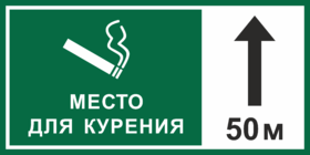 Табличка указатель «Место для курения» со стрелкой, которая показывает направление расположения места для курения и расстояние до него. Комфортная бело-зеленая цветовая гамма, корректное и информативное сообщение – такая табличка будет особенно уместна в компании, которая предпочитает дипломатичный стиль общения с сотрудниками и гостями.