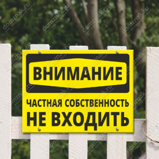 Психологи утверждают, что жёлтый цвет лучше других привлекает внимание людей, а надписи на таком фоне замечают все без исключения. Если вы хотите гарантированно оградить частную собственность от посторонних лиц, купите табличку «Частная собственность, не входить» с запретом на вход.
