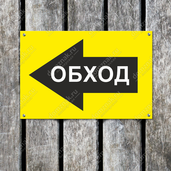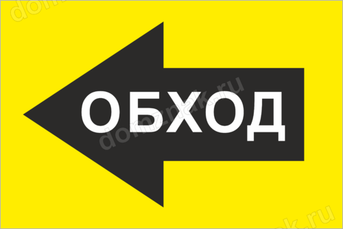 Табличка с указателем движения и надписью «Обход» поможет вам объяснить людям, куда следует идти, чтобы обойти препятствие или закрытую зону. Чёткая большая стрелка на привлекающем взгляды жёлтом фоне гарантированно попадёт в поле зрения прохожих. Купите табличку «Обход» в интернет-магазине Домзнак™.