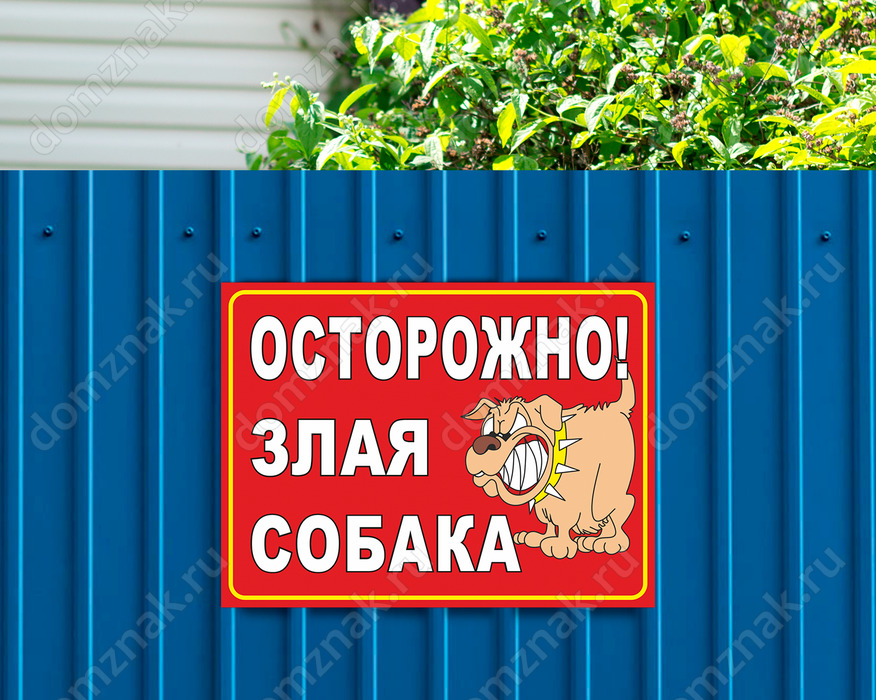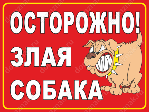 Ищете табличку о злой собаке? Выбирайте эту. Здесь ничего лишнего: надпись на красном фоне и изображение пса, готового сорваться с места в любой момент. Предлагаем вам купить классическую предупредительную табличку, которая может быть выполнена как на металлической, так и на пластиковой основе.