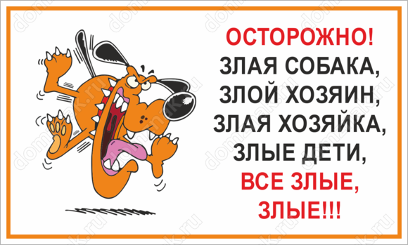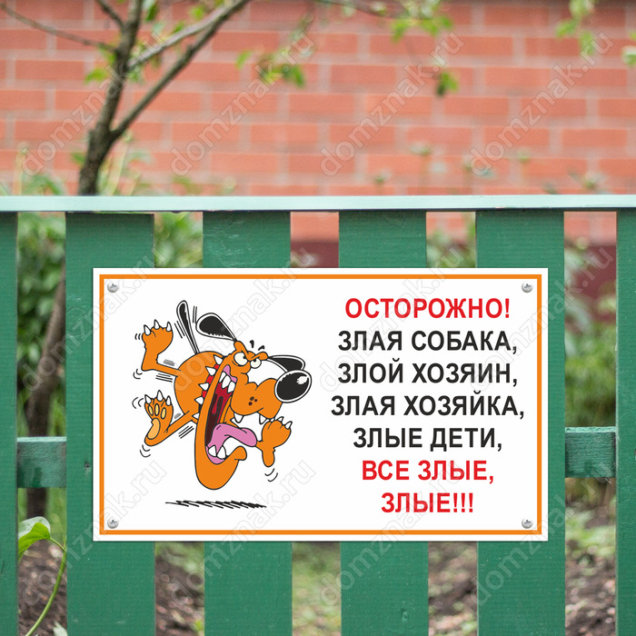 Добавьте юмора в жизнь — купите табличку с забавной надписью, мимо которой невозможно пройти без улыбки. Прикольная табличка «Осторожно злая собака, все злые» с весёлым предупреждением и прямое назначение выполняет, ограждая вашу собственность от кражи и посягательств, и красноречиво говорит о вас, как о человеке с юмором.