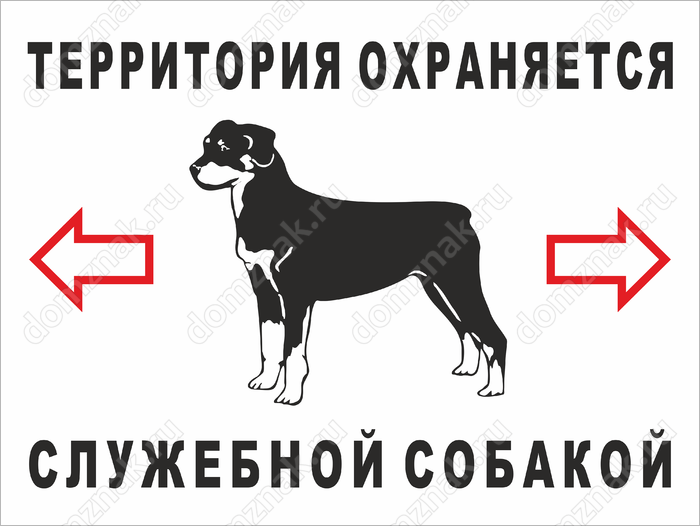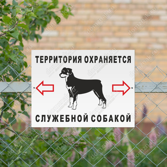 Табличка «Территория охраняется служебной собакой» не даст повода усомниться, что на этой территории всё под охраной серьёзно обученной собаки. Если вы хотите снизить процент правонарушений в отсутствие собаки или хотите предотвратить попытки проникнуть в ваш огород, гаражный кооператив или на предприятие, советуем купить эту табличку.