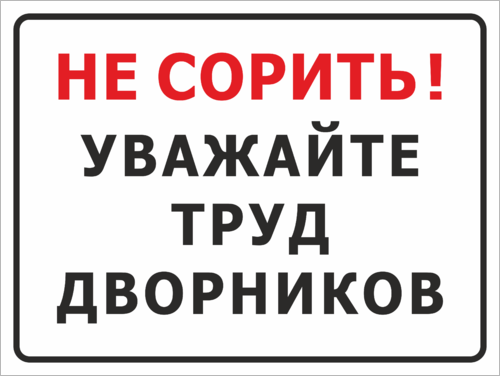 Ежедневная уборка придомовой территории – нелегкий труд. Разместите табличку «Не сорить! Уважайте труд дворников». Напомните жителям дома, что кто-то каждое утро метет улицы и дворы – и достаточно просто не бросать мусор под ноги, чтобы жить в чистоте.