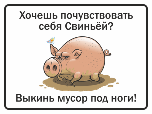 Кто хочет почувствовать себя хрюшкой? Тот, кто мусорит там, где живет и ходит. Оригинальная табличка напомнит прохожим, что для мусора есть строго отведенные места, и заботится о чистоте окружающего мира нужно каждому.