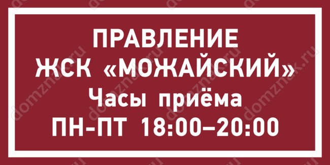 Информационная табличка «Часы приема ЖСК» сообщает о графике работы Жилищно-Строительного кооператива. Использована темно-красная цветовая гамма, табличка оформлена рамкой, шрифт – сдержанно-деловой.