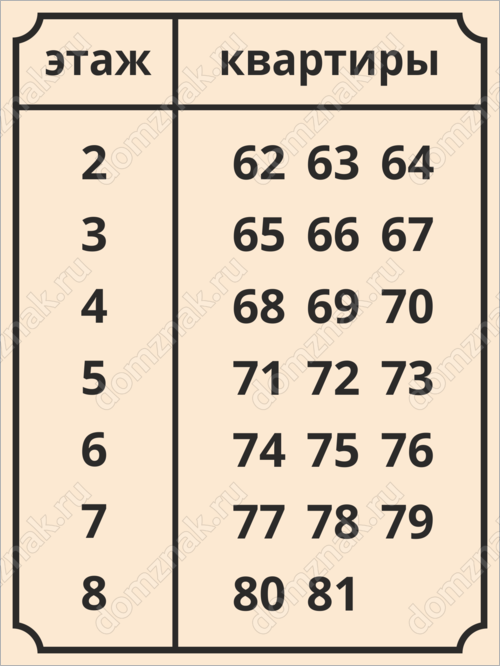 Если вы не хотите, чтобы информация о поэтажном расположении квартир была доступна посторонним, закажите табличку, которую можно повесить в подъезде – она поможет вашим гостям быстро попасть на нужный этаж. Табличка изготовлена в красивых бежевых тонах и будет гармонично выглядеть на стене, окрашенной в любой цвет.