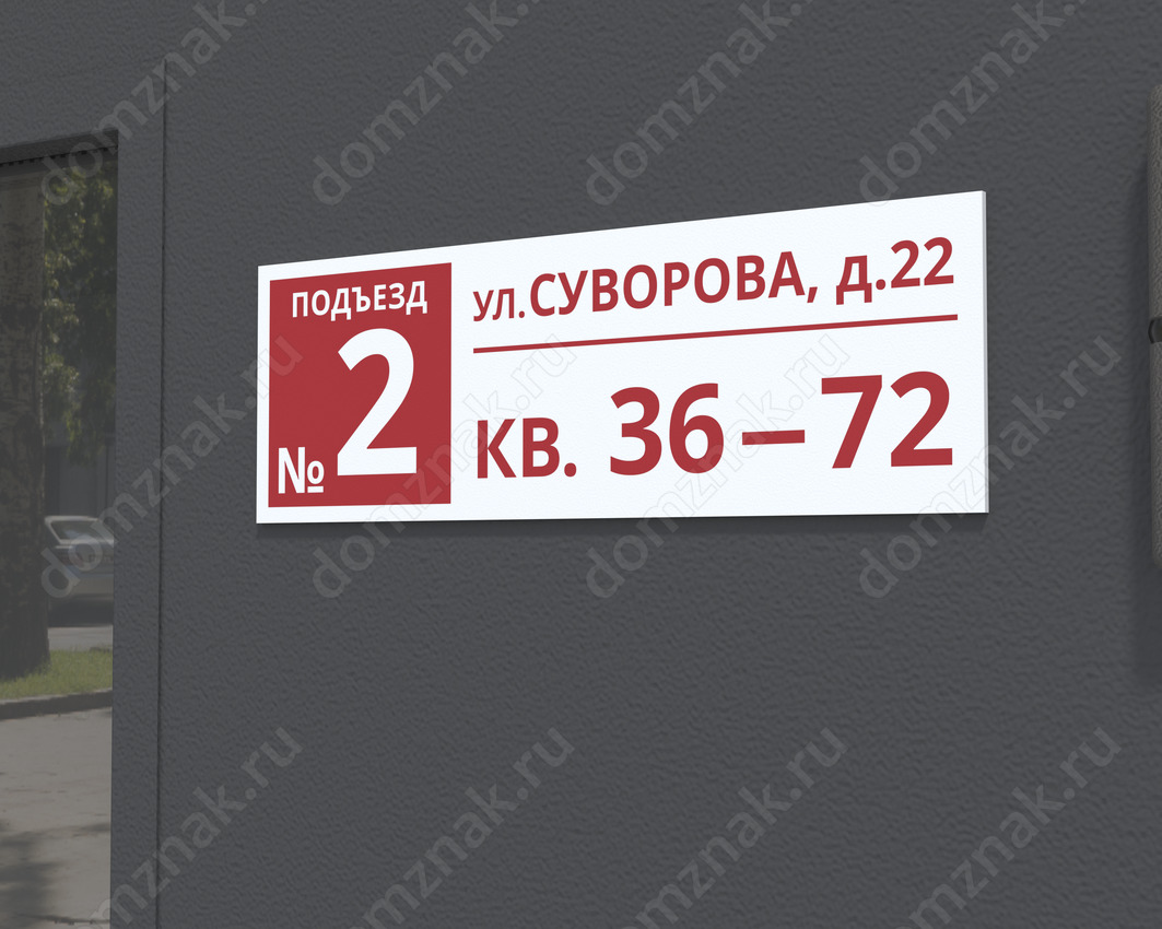 Благородство бардового цвета, необычное дизайнерское решение, оригинальное расположение информации – такая табличка на подъезде может стать ярким акцентом на фасаде дома. Здесь есть все необходимые сведения – адрес, номер подъезда и диапазон квартир. Стильное решение – для любого дома.