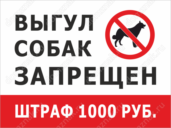 Табличка «Выгул собак запрещен, штраф 1000 рублей» изготавливается на основе из пластика ПВХ или оцинкованного металла.