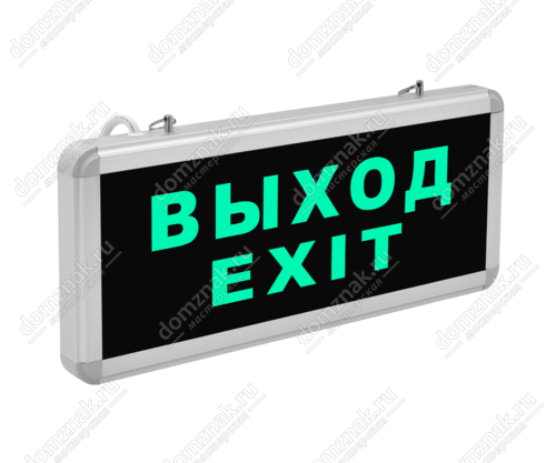 Светильник аварийный светодиодный «Выход - exit» имеет встроенную батарею, которая обеспечит автономную работу устройства, при потере электричества, на протяжении 90 минут. Корпус устройства выполнен из алюминия и цветного стекла. Светильник может крепиться как на стены, так и на потолок при помощи цепочки (поставляется отдельно). При установке второго стекла, световой указатель становится двусторонним.