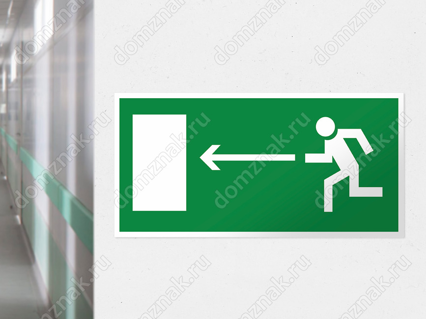 Эвакуационный указатель «Направление к эвакуационному выходу налево» (код E04), устанавливается на стенах помещений для указания направления движения к эвакуационному выходу.