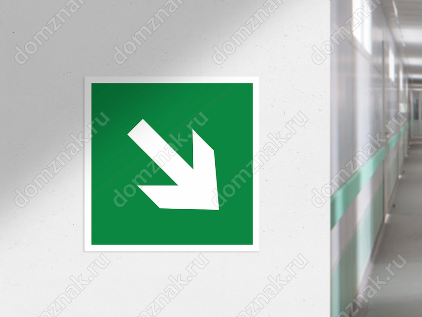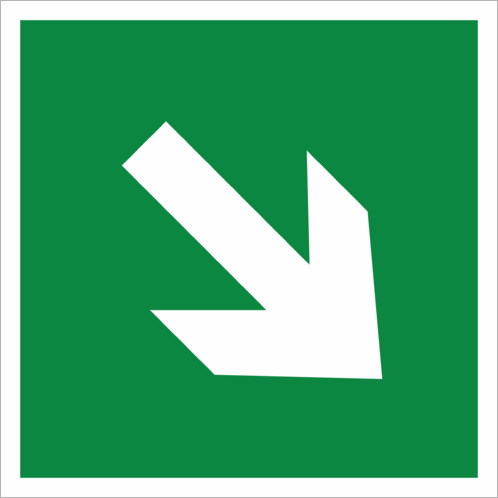 Эвакуационный указатель «Направляющая стрелка под углом 45» (код E02-02), используется вместе с другими эвакуационными знаками для указания направления движения.