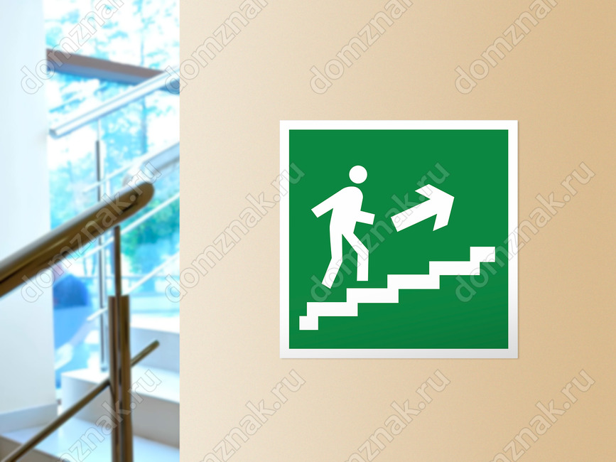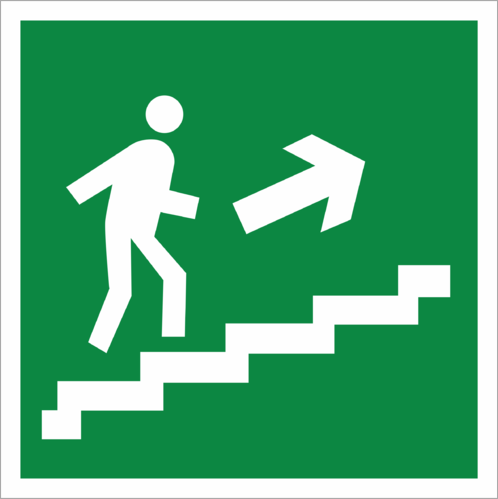 Указатель «Направление к эвакуационному выходу по лестнице вверх» (код E16), устанавливается на лестничных площадках и стенах, прилегающих к лестничному маршруту.