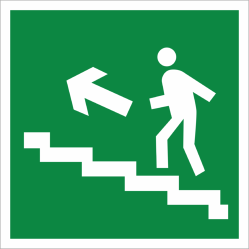 Знак «Направление к эвакуационному выходу по лестнице вверх» (код E15), устанавливается на лестничных площадках и стенах, прилегающих к лестничному маршруту.