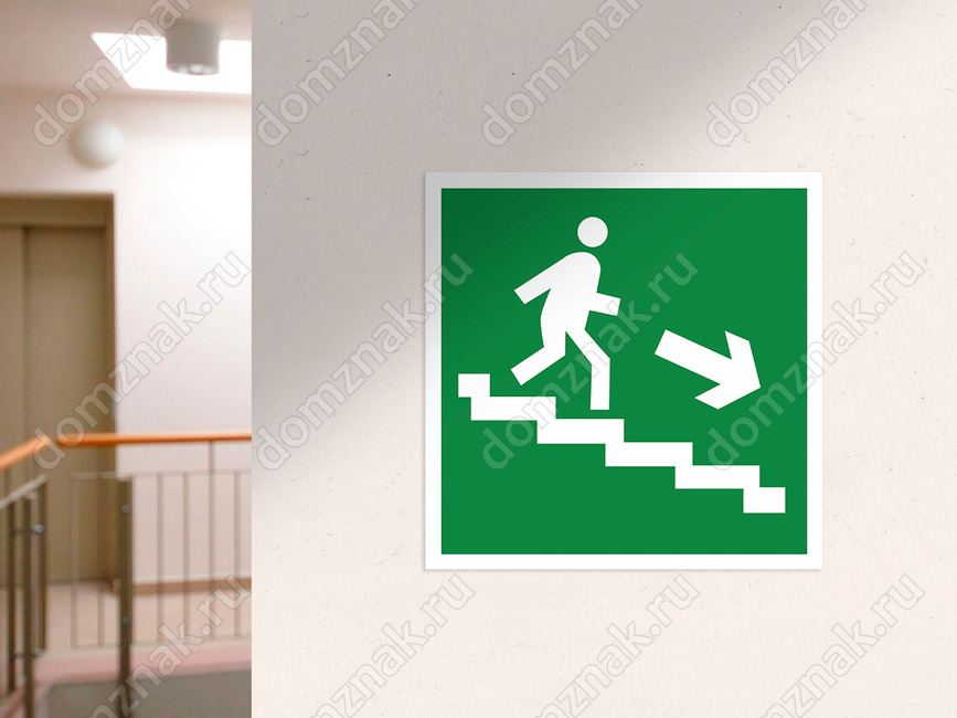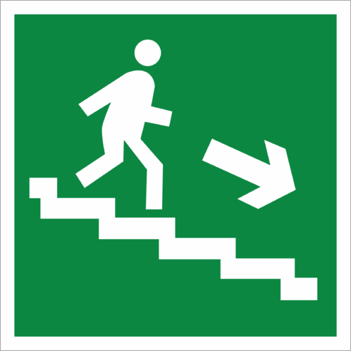 Знак «Направление к эвакуационному выходу по лестнице вниз» (код E13), устанавливается на лестничных площадках и стенах, прилегающих к лестничному маршруту.