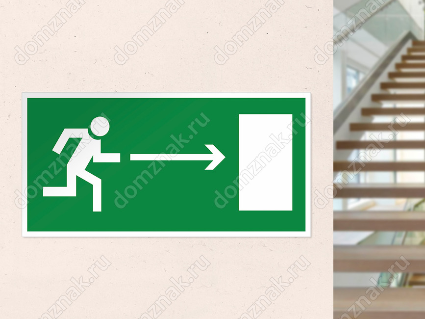 Эвакуационный знак «Направление к эвакуационному выходу направо» (код E03), устанавливается на стенах помещений для указания направления движения к эвакуационному выходу.