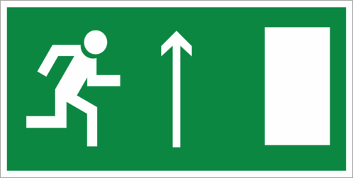 Знак «Направление к эвакуационному выходу прямо» (код E11), устанавливается над проходами, проемами, в помещениях большой площади. Размешается на верхнем уровне или подвешивается к потолку.