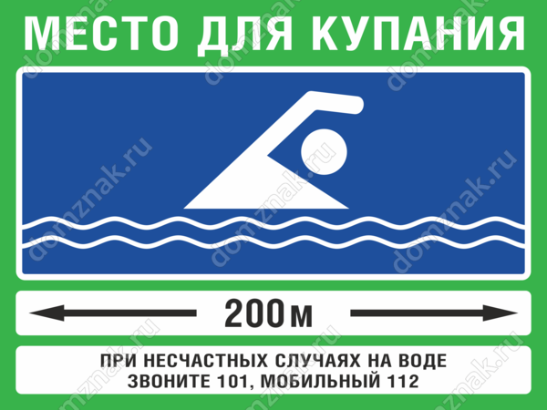 Табличка «Место для купания» изготавливается на основе из пластика ПВХ или оцинкованного металла.