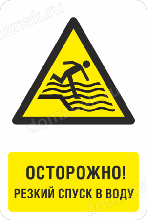 Знак «Осторожно! Резкий спуск в воду» изготавливается на основе из пластика ПВХ или оцинкованного металла.