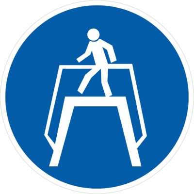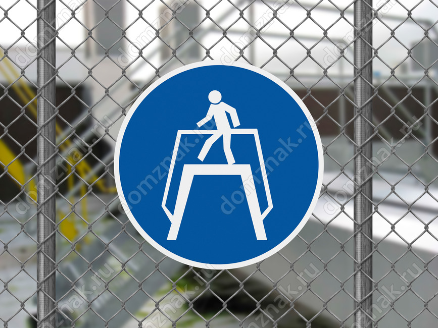 Предписывающий знак безопасности «Переходить по надземному переходу» (код M12), используется на участках и территориях, где установлены надземные переходы.