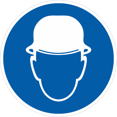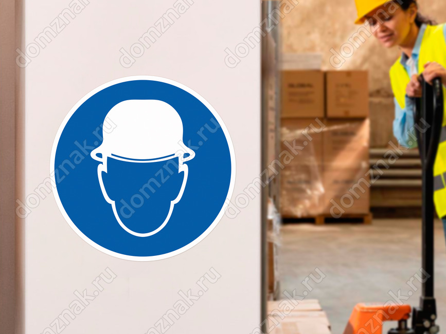 Предписывающий знак безопасности «Работать в защитной каске» (код M02), используется на рабочих местах и участках, где требуется защита головы.