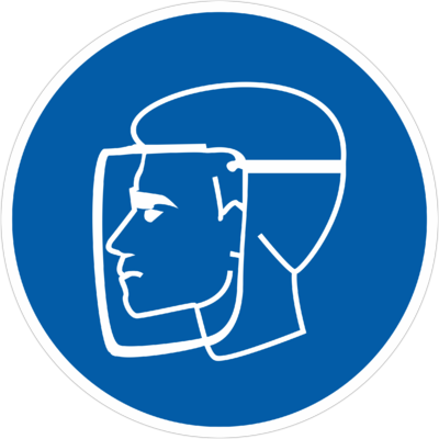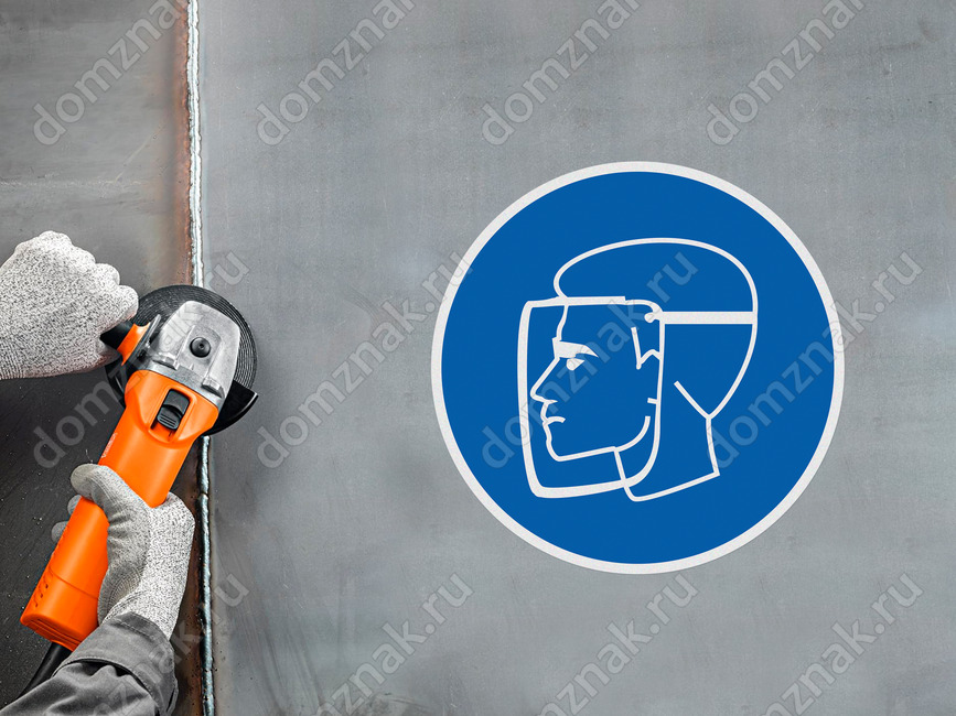 Предписывающий знак безопасности «Работать в защитном щитке» (код M08), используется на рабочих местах и участках, где необходима защита лица и органов зрения.