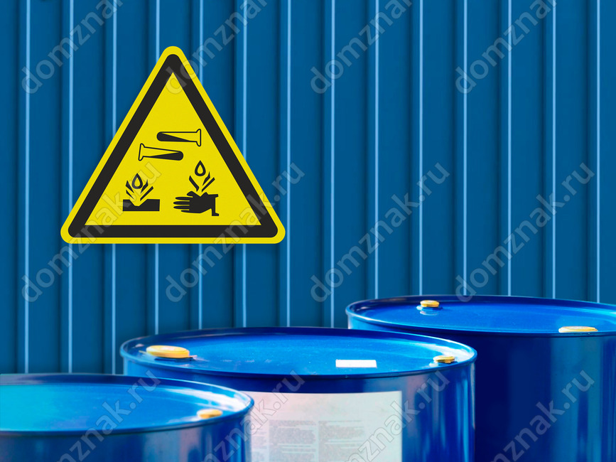 Знак «Опасно, едкие и коррозионные вещества» изготавливается в нескольких вариантах: