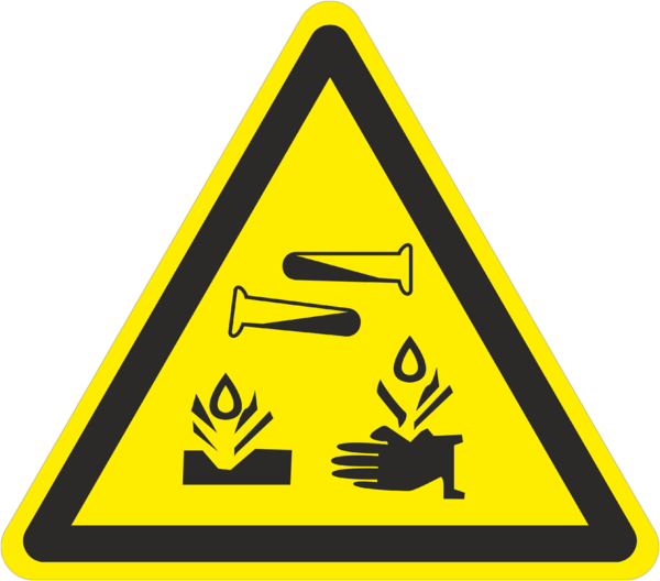 Предупреждающий знак безопасности «Опасно. Едкие и коррозионные вещества» (код W04), используется в местах хранения, выделения, производства и применения едких и коррозионных веществ.