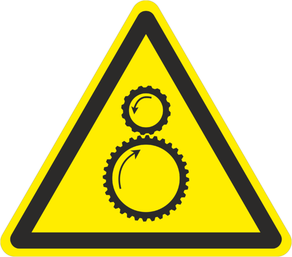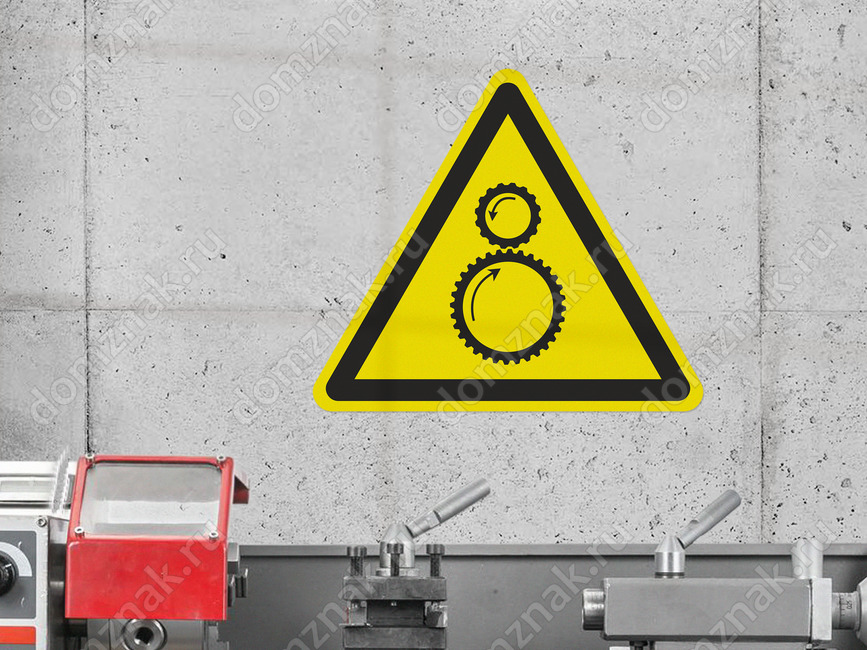 Предупреждающий знак безопасности (табличка, наклейка) «Осторожно. Возможно затягивание между вращающимися элементами» (код W29) используется на рабочих местах и оборудовании, имеющем вращающиеся элементы.