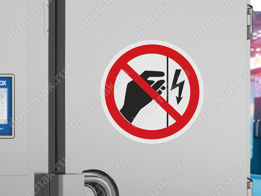 Знак (наклейка) «Запрещается прикасаться. Корпус под напряжением» (код P09) устанавливается на поверхности корпусов, щитов и т.п., где есть возможность поражения электрическим током. (ГОСТ Р 12.4.026-2001)
