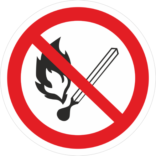 Запрещающий знак безопасности «Запрещается пользоваться открытым огнем и курить» (код P02) используется, когдакогда открытый огонь и курение могут стать причиной пожара. На входных дверях, стенах помещений, участках, рабочих местах, емкостях, производственной таре. (