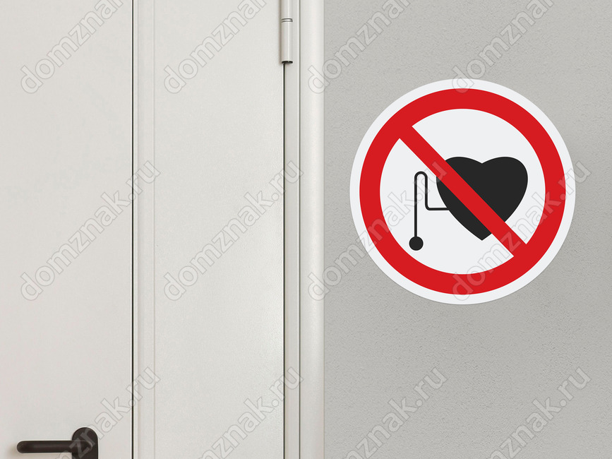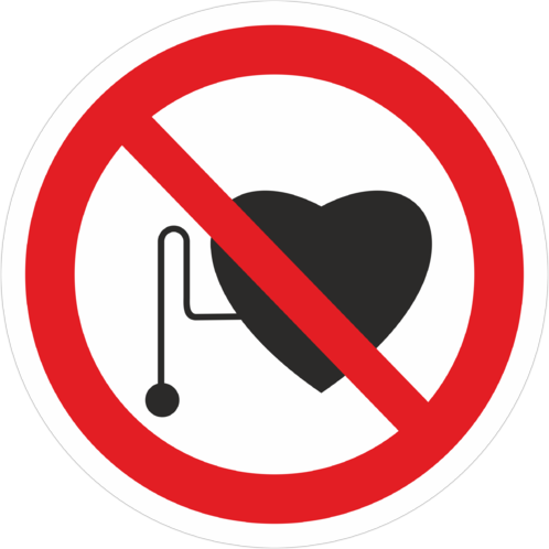 Знак «Запрещается работа людей со стимуляторами сердечной деятельности» изготавливается в нескольких вариантах: