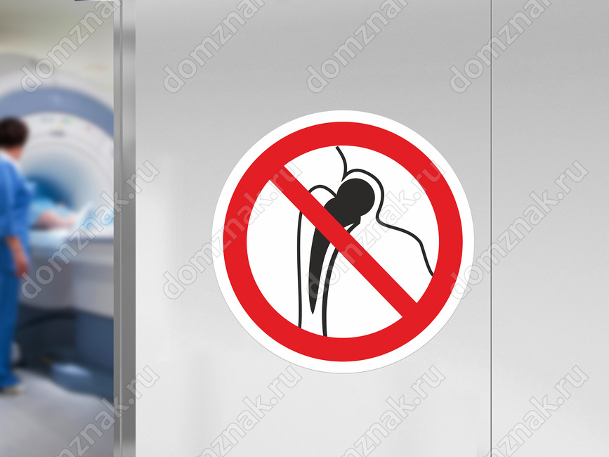 Знак «Запрещается работа (присутствие) людей, имеющих металлические имплантанты» (код P15) устанавливается на местах, участках и оборудовании, где запрещено работать или находиться людям с вживленными металлическими имплантантами.